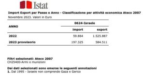 Statistik perdagangan luar negeri Italia menunjukkan bahwa senjata dan amunisi senilai €584.511 (sekitar $630.000) diekspor ke Israel pada November 2023, ketika Gaza sedang dibom. [ISTAT/Altrekonomia][/caption]Menurut ISTAT, sekitar €7.000 dari penjualan ini berkaitan dengan senapan, karabin, dan pistol dengan pegas, udara atau gas bertekanan, senjata tidak mematikan dan senjata serupa lainnya.