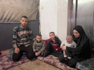 Sharif Kafarneh' (kiri), istrinya Marwa (kanan), dan ketiga putranya yang masih hidup (tengah) di tempat penampungan mereka di Rafah. (Foto: Tareq Hajjaj/Mondoweiss)