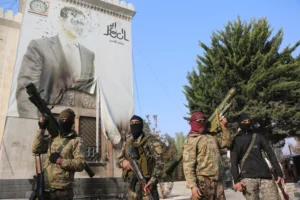Pejuang perlawanan di depan gambar Presiden Suriah Bashar al-Assad di pusat Provinsi Hama. (Al Jazeera)[/caption]