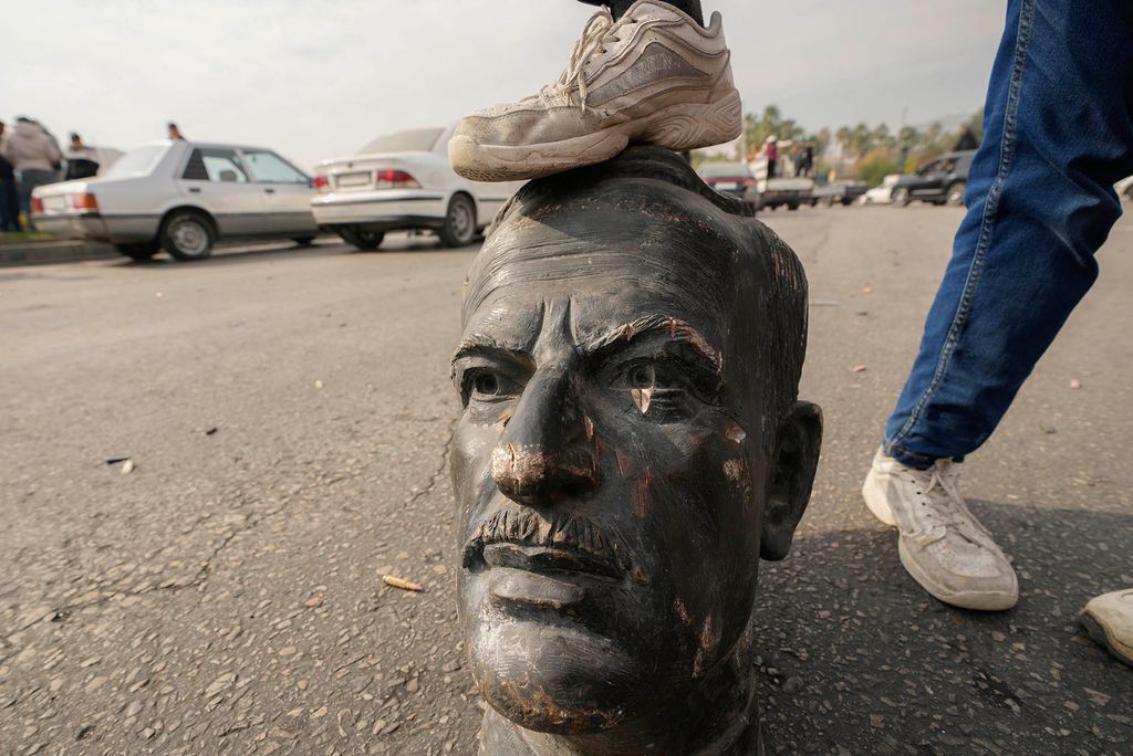Kekalahan Diktator Suriah Hafez al-Assad—Dirayakan dengan Patung Kepalanya yang Pecah Dipijak oleh Seorang Pejuang pembebasan Suriah yang Menang (ap)[/caption]